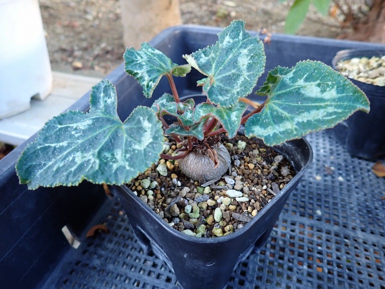 7月15日に採種したガーデンシクラメンの種を蒔いてみることにしました。はたして発芽するのでしょうか。 【2023年10月12日】 まずは種を取り出すところから始めます。種は茶色い殻の中にたくさん入っているようです。 ![]() 殻を割ってみると、中から種がこぼれるように出てきました。 ![]() 大きめの種を選んで蒔くことにしました。 ![]() 【2023年10月13日】 セルトレーに種まき培土を入れ、土を十分に湿らせてから中央に10mmほどの深さの穴をあけ、1セル当たり1〜2粒を蒔きました。最後に覆土して軽く水をかけ、明るい日陰に置きました。 ![]() 【2023年11月29日】 種まきから47日目。発芽しました。今秋に蒔いた種の中でもっとも遅い登場です。 ![]() 【2024年1月23日】 種まきから102日目。寒くなってからはトレーごと発泡スチロール箱に入れ、昼は上蓋を開け、夜は閉じています。葉の大きさに変化が見られません。この調子では、花が咲くのはだいぶ先になりそうです。 ![]() 【2024年3月23日】 やっと複数の葉が展開を始めました。これから暖かくなるので成長速度が早くなるかな。 ![]() 【2024年4月18日】 セルトレーに植えておいてもなかなか大きくならないので、ポット上げすることにしました。 ![]() 苗を取り出してみると、白い球根が出来ていました。 ![]() 全部で8本の苗がありましたが、葉が元気な6本を山野草のブレンド(赤玉土、鹿沼土、桐生砂)の土に植え替えました。山野草のブレンドにした理由は、これから高温多湿の時期になるので水はけを重視したほうがよいと考えたからです。木陰に置いて、土が乾いたら水をやり、たまに液肥を与えればよいでしょう。 ![]() 【2024年6月30日】 葉が大きくなり、枚数も増えています。暑さはこれからが本番ですが、枯れずに成長しているようです。 ![]() ポット上げした時には白かった球根も、茶色に変化しました。 ![]() 【2024年10月16日】 日中の気温が下がってきたので、木陰から日なたに移動させました。小さかった2株は夏の間に枯れてしまいました。残りの4株は近いうちに一回り大きなポットに植え替える予定です。 ![]() 【2024年12月6日】 枯れずに残っていた4株のうち1株は、やがて球根が割れ葉が落ちて枯れてしまいました。水やりの時に上から水をかけていたので、球根が傷んでしまったのかもしれません。現在、残りの3株は軒下に移動させて乾かし気味に管理しています。 ![]() 【2024年12月10日】 一回り大きなプラポットに植え替えました。用土は草花用培養土に赤玉土と鹿沼土をブレンドしたものにしました。 ![]() 【2025年3月19日】 枯れることなく、無事に冬を越すことができたようです。冬の間、昼は明るい軒下、夜は室内で管理していました。春からの成長に期待します。 ![]() 【2025年3月24日】 つぼみを見つけました。株が小さく葉の数も少ないので、「今年も花は咲かないのかな」と思っていたところでした。白っぽく見えますが、何色かは咲いてからのお楽しみです。 ![]() 【2025年4月25日】 開花しました。結局生き残ったのはこの2株のみ。4月になってから1株が球根が割れて枯れ、左の株も球根が割れているので生育が思わしくないです。実際に育ててみて初めてガーデンシクラメン農家の苦労を知ることができました。 ![]() こちらがタネを採った親株です。2022年10月28日にポット苗で買ったものです。買った時から何倍も大きくなりました。花色を見ると、子株と同じであることが分かります。 ![]() 【2025年8月1日】 木陰に置いて夏越し中です。左の株はやや葉が黄色くなっていますが今のところ生きています。一方、右の球根が割れていた株は、つぼみまで出たのですが葉が落ちてしまったので枯れてしまうでしょう。 ![]() 【2025年10月3日】 球根が割れた株は枯れてしまい、残ったのはこの一株だけになりました。木陰の涼しい場所の置いていたのですが、葉がダメージを受けてしまったようです。涼しくなったこの時期に、株を充実させたいと思います。 ![]() 【2025年11月29日】 葉の色が濃くなり、小さな葉が出てきました。近年はガーデンシクラメンの生育適温である10℃〜20℃の期間が短いので、なかなか大きくなりません。 ![]() |
