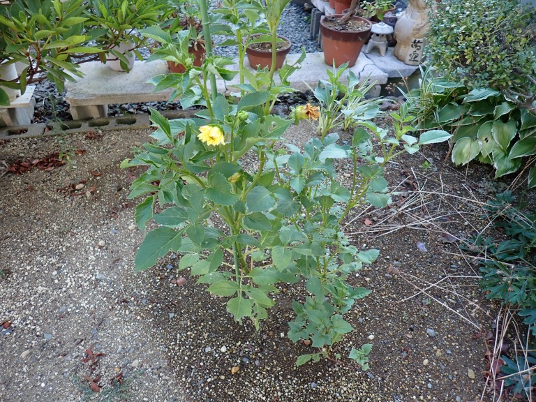 | ダリアポンポンミックスを種から育てる 【2024年5月24日】 近所のホームセンターで「ダリアポンポンミックス」のタネを買いました。買ったのは、ジニアプロフュージョンシリーズと同じく4月下旬だったのですが、真夏を高温を避けて開花させたかったので、タネをまくのを少し遅らせました。 ![]() 袋の中には36個のタネが入っていました。 ![]() 長さは8mmくらいです。発芽の向きがわからないので、とりあえず水平にタネをまくことにします。 ![]() いつものセルトレーとポット育苗培土の組み合わせです。タネの深さは5mmにしました。 ![]() 【2024年5月28日】 発芽しました。10本くらいはあります。初めてタネまきをした植物なので発芽するか心配でしたが、とりあえず一安心です。 ![]() タネの形と同様に、子葉も細長い形をしています。 ![]() 【2024年6月8日】 発芽率は8割ほどです。多くの苗で本葉が2枚出ています。そろそろポット上げしてもよさそうです。 ![]() 【2024年6月14日】 梅雨入りの発表はまだなのに、夏日の連続です。今日も暑くなる予報なので、午前中にポット上げをすることにしました。 ポット上げ前のセルトレーです。本葉は2〜4枚で、苗同士が干渉しています。 ![]() 3号ポットと、いつものポット育苗培土の組み合わせで、37ポット作りました。しばらくは直射日光の当たらない環境に置くことにします。 ![]() 【2024年7月5日】 自立が難しくなってきたので摘芯することにしました。 ![]() 葉腋からわき芽が出始めています。背丈をあまり伸ばしたくないので二節目の上で切りました。 ![]() 【2024年7月15日】 梅雨らしい蒸し暑い日が続いています。わき芽が成長し葉が展開を始めたので、日陰の花壇に定植しました。株間隔は30cmです。 ![]() 二節目からのわき芽が早く成長し、少し遅れて一節目が出てきました。草丈があまり伸びすぎると倒れやすくなるので、できれば小さくまとまってほしいです。 ![]() 【2024年8月4日】 わき芽が成長し、葉の枚数が増えました。日常の管理は基本的には朝晩の水やりだけですが、高温で葉が萎れた場合には、冷却のために昼間でも上から水をかけることがあります。 ![]() 【2024年9月4日】 8月上旬は暑い日が多く、葉が萎れたりして成長が遅かったのですが、8月下旬から雨の日が多くなり、あっという間に背丈が70cmほどになりました。雨風で倒れないように、数日前に支柱を立てました。 ![]() つぼみも日に日に増え、早いものでは開花が始まりました。今後が楽しみですね。 ![]() 【2024年10月1日】 ポンポンダリアの名の通り、次々と花を咲かせています。長く伸びた枝は長めに切って、切り花として楽しんでいます。 ![]() 【2024年11月28日】 最低気温が5℃以下の日が続くようになりました。葉が黄色くなり始めたので、霜が下りる前に球根を掘り上げることにしました。 ![]() 中央の茎から放射状にたくさんの球根がついています。球根を切り離してしまうと芽が出ないことがあるらしいので、切らないように掘り上げました。 ![]() 水洗いをして日なたで乾燥させます。乾燥したら段ボール箱に入れ、来年の植え付け時期まで軒下で保管するつもりです。 ![]() 【2025年8月1日】 昨年掘り起こした球根の一部を春先に植えたところ、今年も花が咲きました。球根から育てたほうが成長が早いですね。 ![]() 無事に二年目の開花を見届けることができたので、これで観察を終わりにします。 |