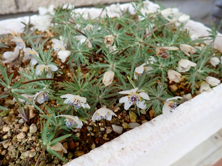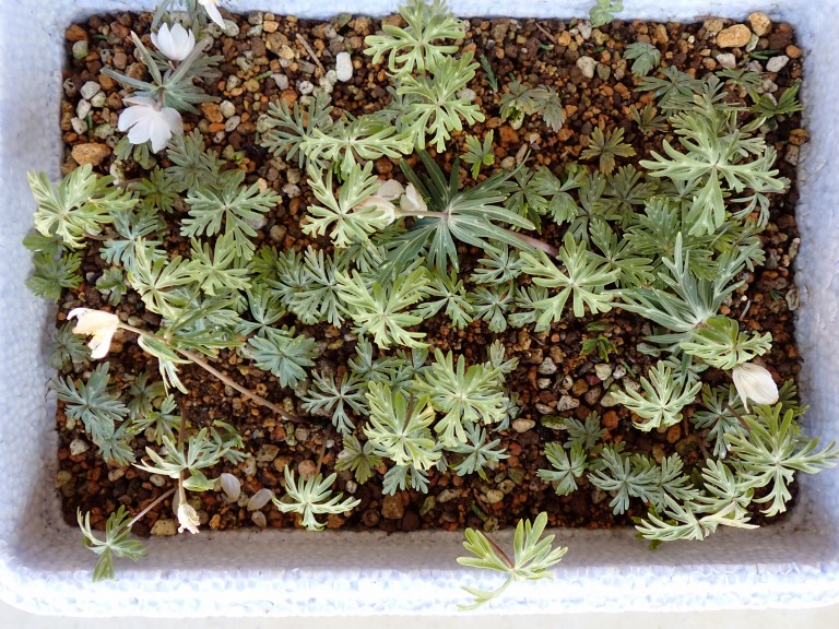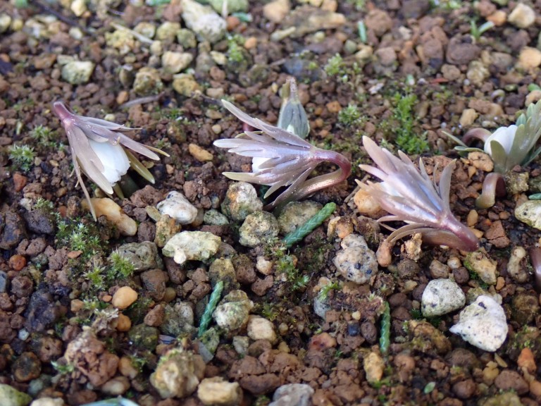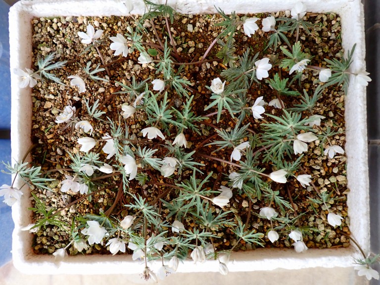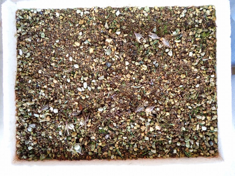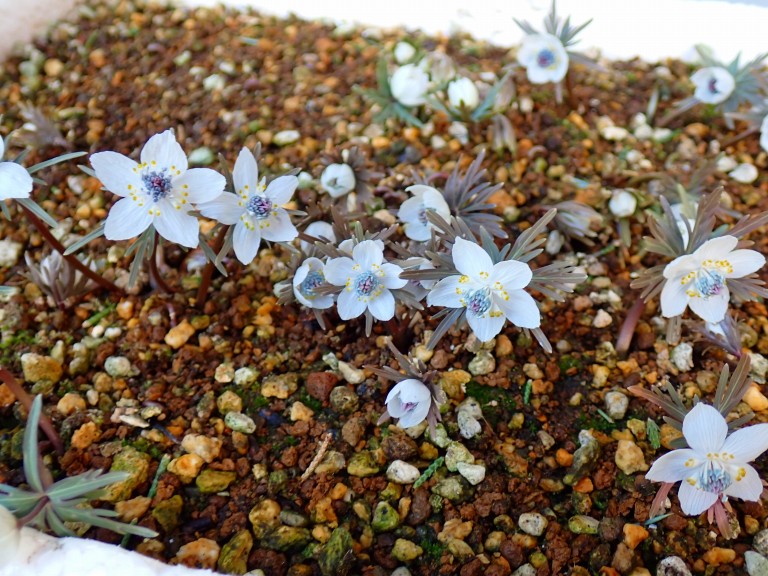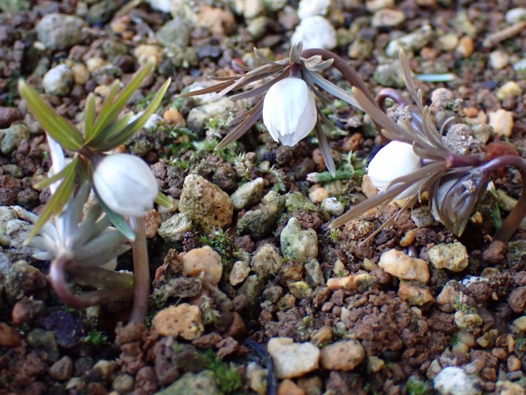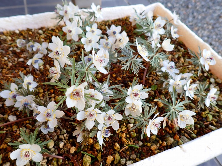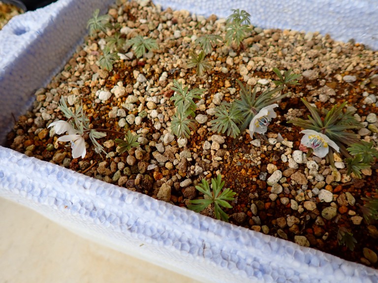 【2025年12月30日】 今年もまもなく終わりですが、セツブンソウの観察は今日からスタートです。 まずは一番大きなスチロール箱の様子です。遠目で眺めただけでは芽が出ているかわかりません。 ![]() 近づいてみると、花芽が出ていました。今年も無事にセツブンソウの観察を続けることができそうです。 ![]() 次に、小さなスチロール箱のほうを見てみましょう。左下が今年の春に発芽した箱、それ以外が今年タネまきをした箱です。どちらもまだ土の表面に変化は見られません。 ![]() 【2026年1月4日】 最低気温が氷点下になる日が続いています。土が凍らないように、夜は発泡スチロールのふたをしています。 ![]() 花芽は順調に伸びています。 ![]() 密集して出てきました。この様子では、あと数日で開花するかもしれません。 ![]() 【2026年1月5日】 開花しました。暖かな日差しを浴びて一気に開花したようです。昨年の開花が1月20日だったので、15日も早く開花したことになります。 ![]() 昨年タネまきした箱からも、発芽が始まりました。 ![]() 【2026年1月8日】 開花が始まってから3日。開花数が一気に増えました。花芽を含めると「40近く」あるので、昨年の開花数の「42」を超えるのは間違いなさそうです。 ![]() 太陽に向かい、密集して咲いています。今年こそはセツブンソウのブーケを見たいものです。 ![]() 【2026年1月16日】 春のような暖かさに誘われて、一気に開花しました。開花数は「66」で、昨年の開花数の「42」を軽く上回りました。 ![]() 密集して咲くことによって花茎が倒れず、見栄えがよいです。 ![]() まさに冬の打ち上げ花火ですね。 ![]() こちらでも子葉が続々と出てきました。 ![]() 【2026年1月20日】 開花数は「68」になりました。つぼみは見当たらないので、今シーズンの花はこれでおしまいです。 ![]() 1月5日に咲いた花は、早くも枯れ始めています。開花から今日まで気温が高い日が続いたためか、長持ちしませんでした。 ![]() 二年目と三年目が混ざった箱では、少し遅れて開花が始まりました。たくさん咲いている姿も豪華で良いですが、少しだけ咲いているのもかわいいものです。 ![]() 【2026年2月4日】 今日は立春。暦の上では春の始まりだがまだまだ寒い。大箱のセツブンソウは早くも結実を始めました。 ![]() 変わり種はないかと探してみると、ありました。結実した花茎の脇から新たな花が咲いていました。 ![]() 2年目と3年目の箱は、御覧の通りの混雑です。思ったよりも2年目の発芽率が良かったみたいです。 ![]() こちらは一年目です。昨年同様、発芽率は非常に高いです。 ![]() |