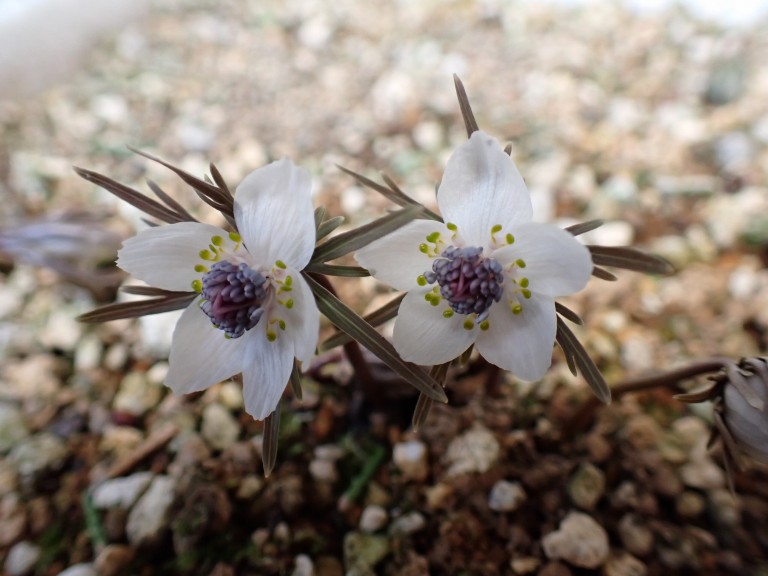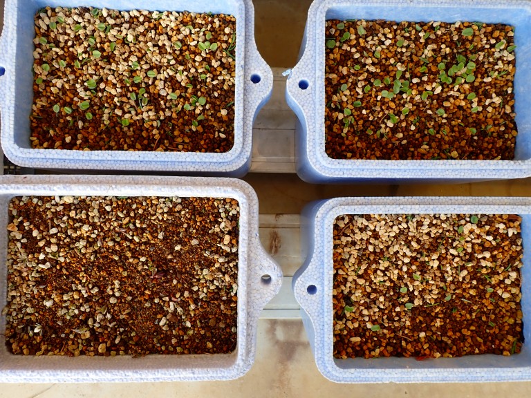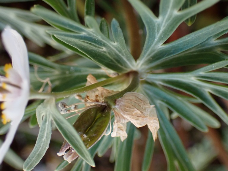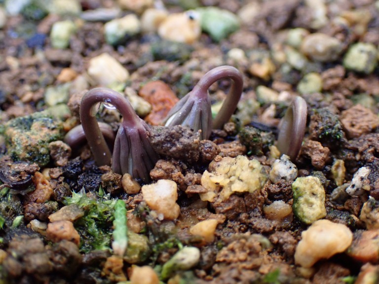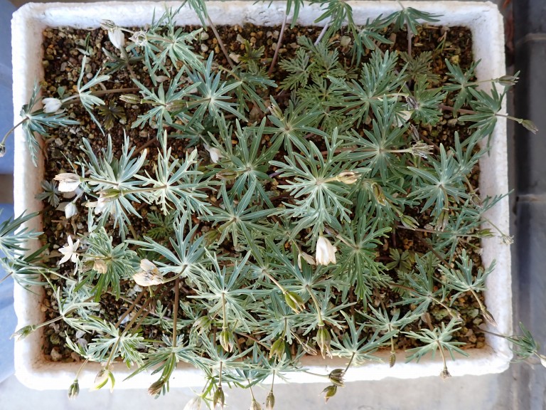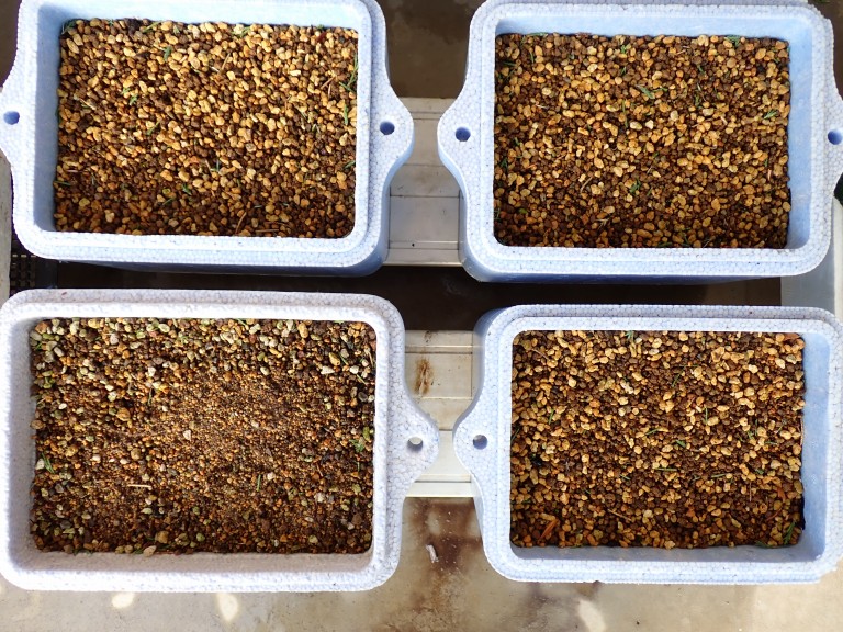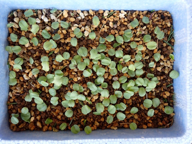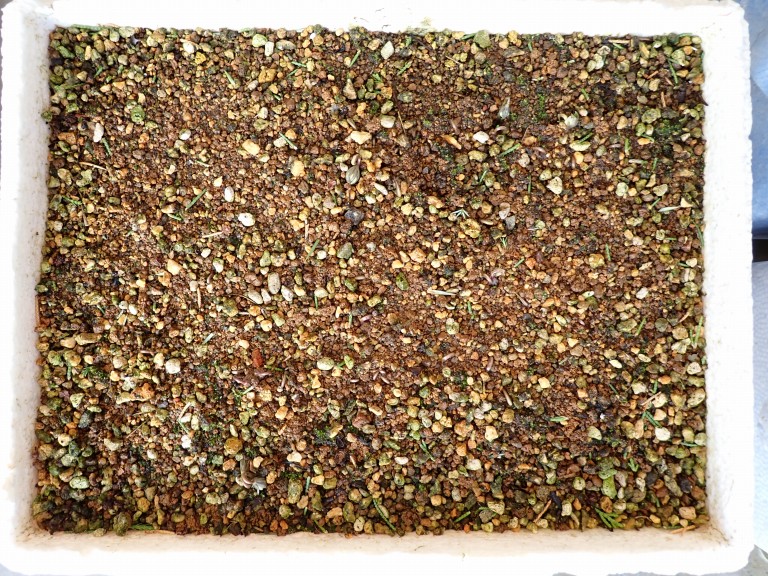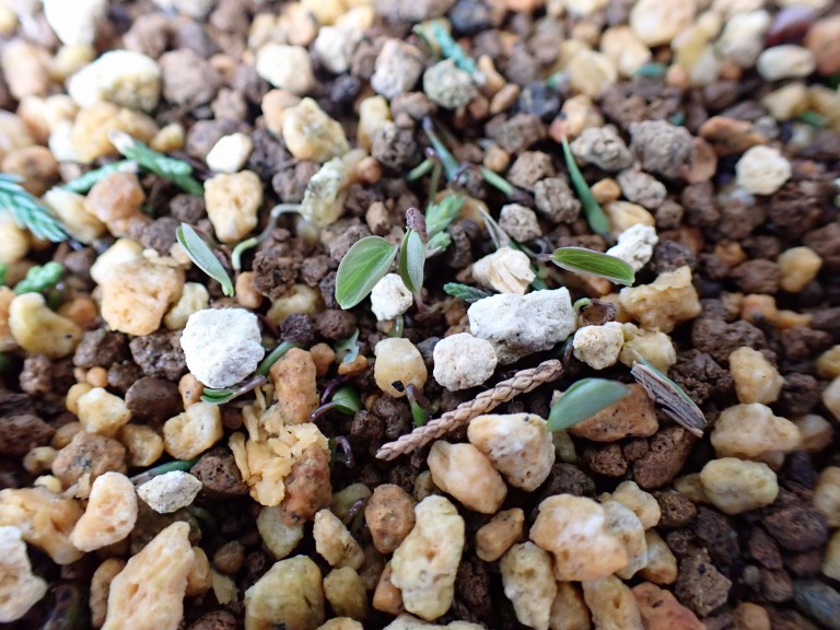 【2025年12月30日】 今年もまもなく終わりですが、セツブンソウの観察は今日からスタートです。 まずは一番大きなスチロール箱の様子です。遠目で眺めただけでは芽が出ているかわかりません。 ![]() 近づいてみると、花芽が出ていました。今年も無事にセツブンソウの観察を続けることができそうです。 ![]() 次に、小さなスチロール箱のほうを見てみましょう。左下が今年の春に発芽した箱、それ以外が今年タネまきをした箱です。どちらもまだ土の表面に変化は見られません。 ![]() 【2026年1月4日】 最低気温が氷点下になる日が続いています。土が凍らないように、夜は発泡スチロールのふたをしています。 ![]() 花芽は順調に伸びています。 ![]() 密集して出てきました。この様子では、あと数日で開花するかもしれません。 ![]() 【2026年1月5日】 開花しました。暖かな日差しを浴びて一気に開花したようです。昨年の開花が1月20日だったので、15日も早く開花したことになります。 ![]() 昨年タネまきした箱からも、発芽が始まりました。 ![]() 【2026年1月8日】 開花が始まってから3日。開花数が一気に増えました。花芽を含めると「40近く」あるので、昨年の開花数の「42」を超えるのは間違いなさそうです。 ![]() 太陽に向かい、密集して咲いています。今年こそはセツブンソウのブーケを見たいものです。 ![]() 【2026年1月16日】 春のような暖かさに誘われて、一気に開花しました。開花数は「66」で、昨年の開花数の「42」を軽く上回りました。 ![]() 密集して咲くことによって花茎が倒れず、見栄えがよいです。 ![]() まさに冬の打ち上げ花火ですね。 ![]() こちらでも子葉が続々と出てきました。 ![]() 【2026年1月20日】 開花数は「68」になりました。つぼみは見当たらないので、今シーズンの花はこれでおしまいです。 ![]() 1月5日に咲いた花は、早くも枯れ始めています。開花から今日まで気温が高い日が続いたためか、長持ちしませんでした。 ![]() 二年目と三年目が混ざった箱では、少し遅れて開花が始まりました。たくさん咲いている姿も豪華で良いですが、少しだけ咲いているのもかわいいものです。 ![]() 【2026年2月4日】 今日は立春。暦の上では春の始まりだがまだまだ寒い。大箱のセツブンソウは早くも結実を始めました。 ![]() 変わり種はないかと探してみると、ありました。結実した花茎の脇から新たな花が咲いていました。 ![]() 2年目と3年目の箱は、御覧の通りの混雑です。思ったよりも2年目の発芽率が良かったみたいです。 ![]() こちらは一年目です。昨年同様、発芽率は非常に高いです。 ![]() |